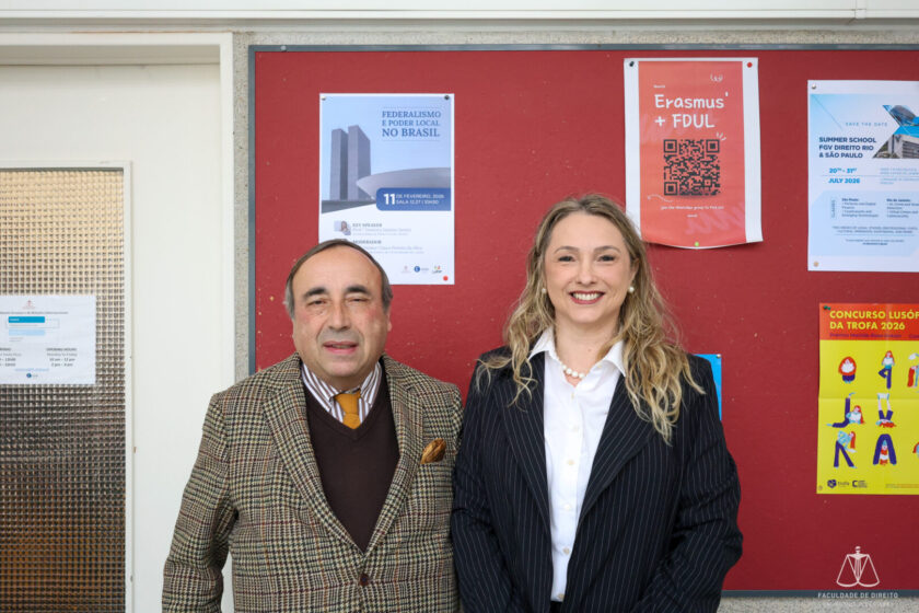 O Gabinete Erasmus e Relações Internacionais promoveu, no passado dia 11 de fevereiro de 2026, a conferência “Federalismo e Poder Local no Brasil”, que teve lugar na Sala 12.27. A sessão contou com a participação da Prof.ª Doutora Janaína Santín, da Universidade de Passo Fundo (Brasil), enquanto oradora convidada, e com a moderação do Prof. Doutor Vasco Pereira da Silva, da Faculdade de Direito da Universidade de Lisboa.