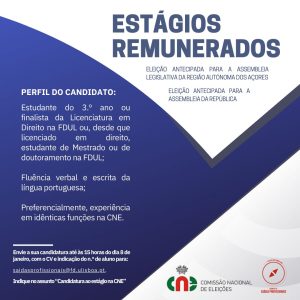 Destaques, Destaques 2Há 2 anosEstágios Remunerados na Comissão Nacional de Eleições | Eleição antecipada para a Assembleia Legislativa da Região Autónoma dos Açores e Assembleia da República