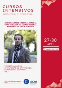 O curso intensivo “Nacionalismos e Federalismos A construcción do Estado Federal no marco da Unión Europea”, lecionado pelo Professor Vicente Sanjurjo, da Universidad de Santiago de Compostela, realiza-se entre os dias 27/04/2026 e 30/04/2026, das 16h00 às 18h30.