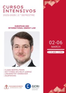 The intensive course “European and International Energy Law”, taught by Professor Claas Germelmann, from the Gottfried Wilhelm Leibniz Universität Hannover, will take place between 02/03/2026 and 06/03/2026, from 11 a.m. to 1 p.m.