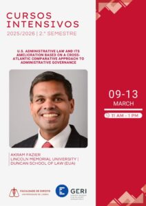 O curso intensivo “U.S. Administrative Law and its Amelioration based on a Cross-Atlantic Comparative Approach to Administrative Governance”, lecionado pelo Professor Akram Fazier, da Lincoln Memorial University – Duncan School of Law, realiza-se entre os dias 09/03/2026 e 13/03/2026, das 11h00 às 13h00.