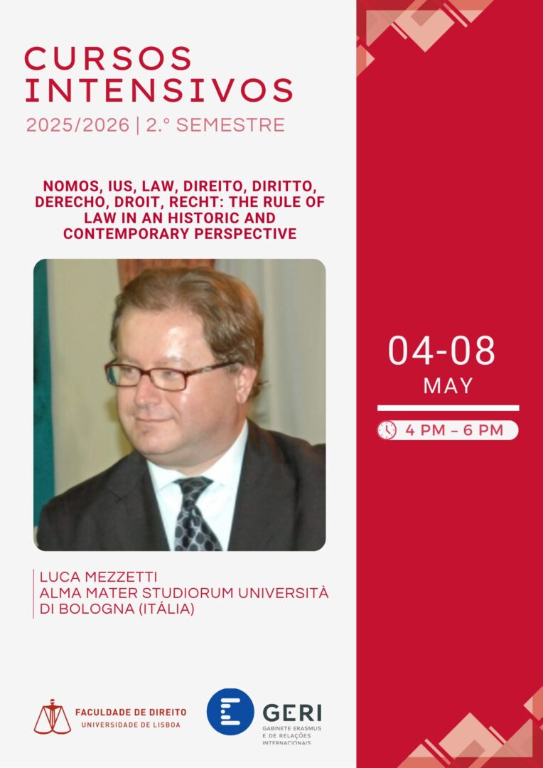 The intensive course “Nomos, IUS, Law, Direito, Diritto, Derecho, Droit, Recht: The Rule of Law in an Historic and Contemporary Perspective”, taught by Professor Luca Mezzeti, from the Alma Mater Studiorum Università di Bologna, will take place between 04/05/2026 and 08/05/2026, from 4 p.m. to 6 p.m.
