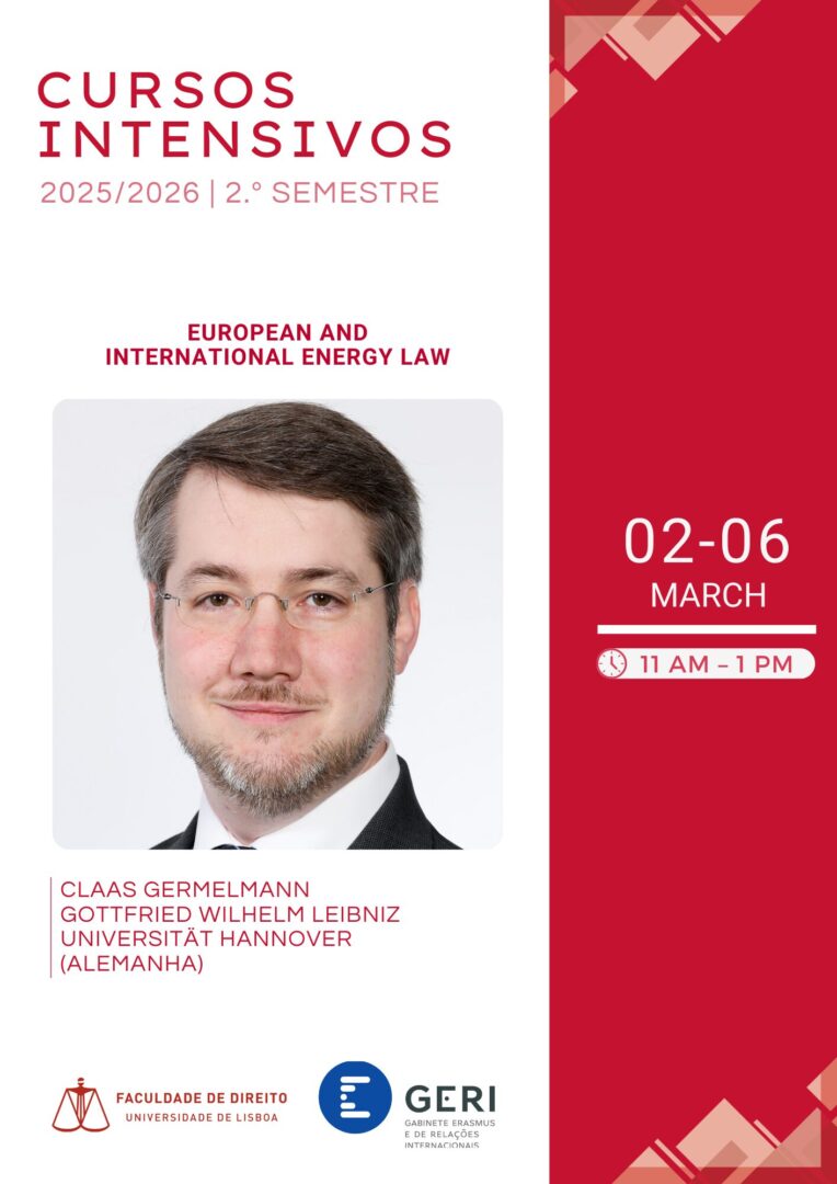 The intensive course “European and International Energy Law”, taught by Professor Claas Germelmann, from the Gottfried Wilhelm Leibniz Universität Hannover, will take place between 02/03/2026 and 06/03/2026, from 11 a.m. to 1 p.m.