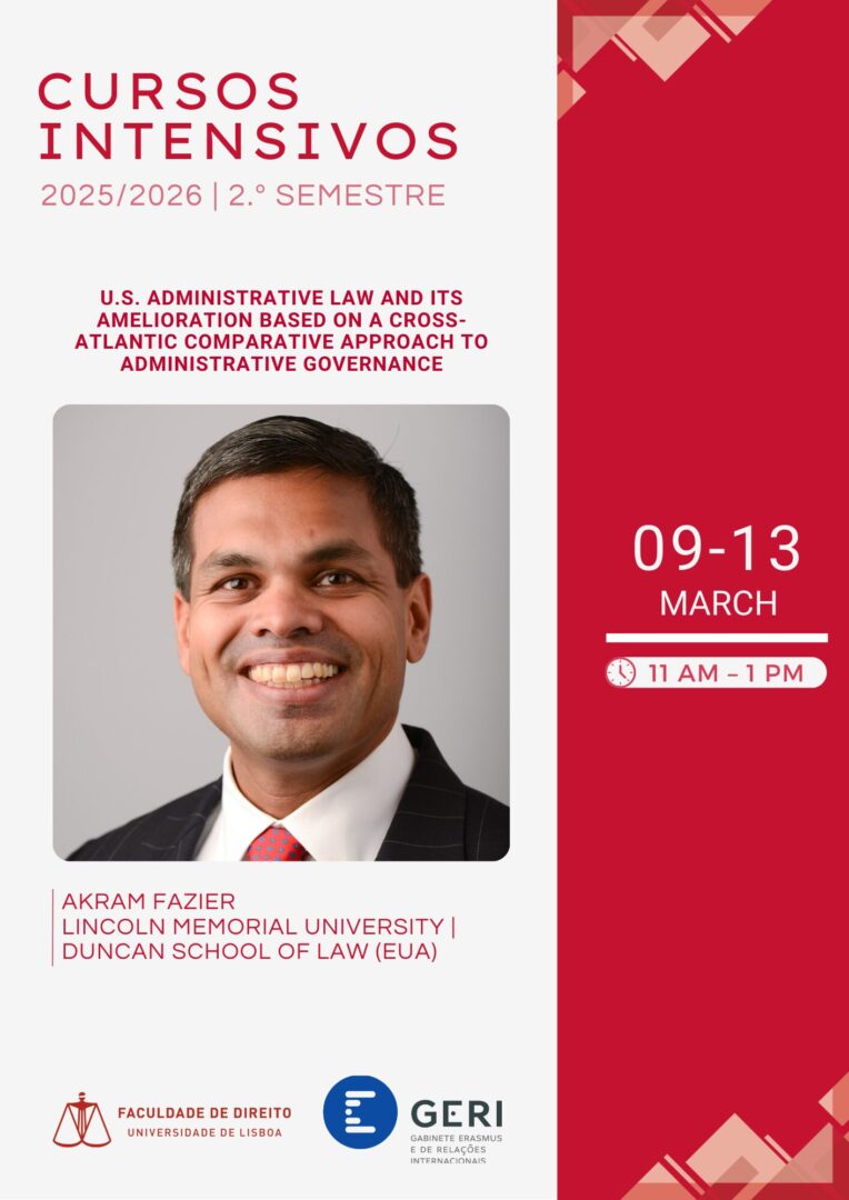The intensive course “U.S. Administrative Law and its Amelioration based on a Cross-Atlantic Comparative Approach to Administrative Governance”, taught by Professor Akram Fazier, from the Lincoln Memorial University – Duncan School of Law, will take place between 09/03/2026 and 13/03/2026, from 11 a.m. to 1 p.m.