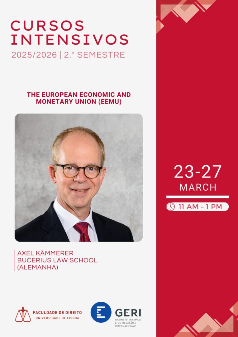 O curso intensivo “The European Economic and Monetary Union (EEMU): Background, Structures, Evolution”, lecionado pelo Professor Axel Kämmerer, da Bucerius Law School, realiza-se entre os dias 23/03/2026 e 27/03/2026, das 11h00 às 13h00.