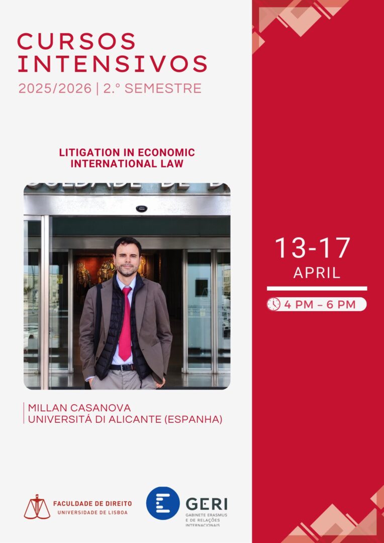 O curso intensivo “Litigation in Economic International Law”, lecionado pelo Professor Millán Requena-Casanova, da Universidad de Alicante, realiza-se entre os dias 13/04/2026 e 17/04/2026, das 16h00 às 18h00.