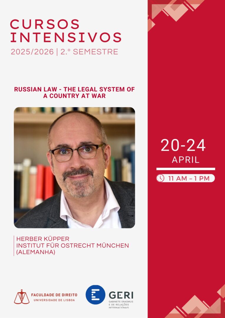 O curso intensivo de “Russian Law: the legal system of a country at war”, lecionado pelo Professor Herbert Küpper, do Institut für Ostrecht, realiza-se entre os dias 20/04/2026 e 24/04/2026, das 11h00 às 13h00.