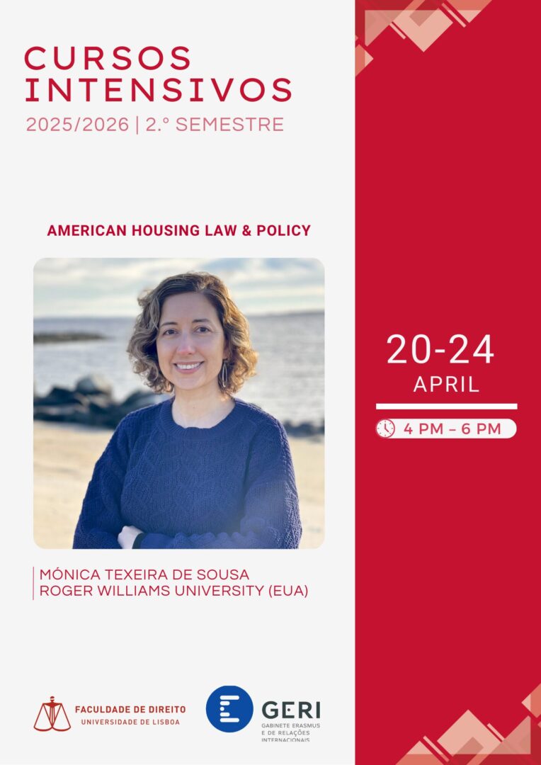 The intensive course “American Housing Law & Policy”, taught by Professora Monica Teixeira de Sousa, from the Roger Williams University, will take place between 20/04/2026 and 24/04/2026, from 4 p.m. to 6 p.m.