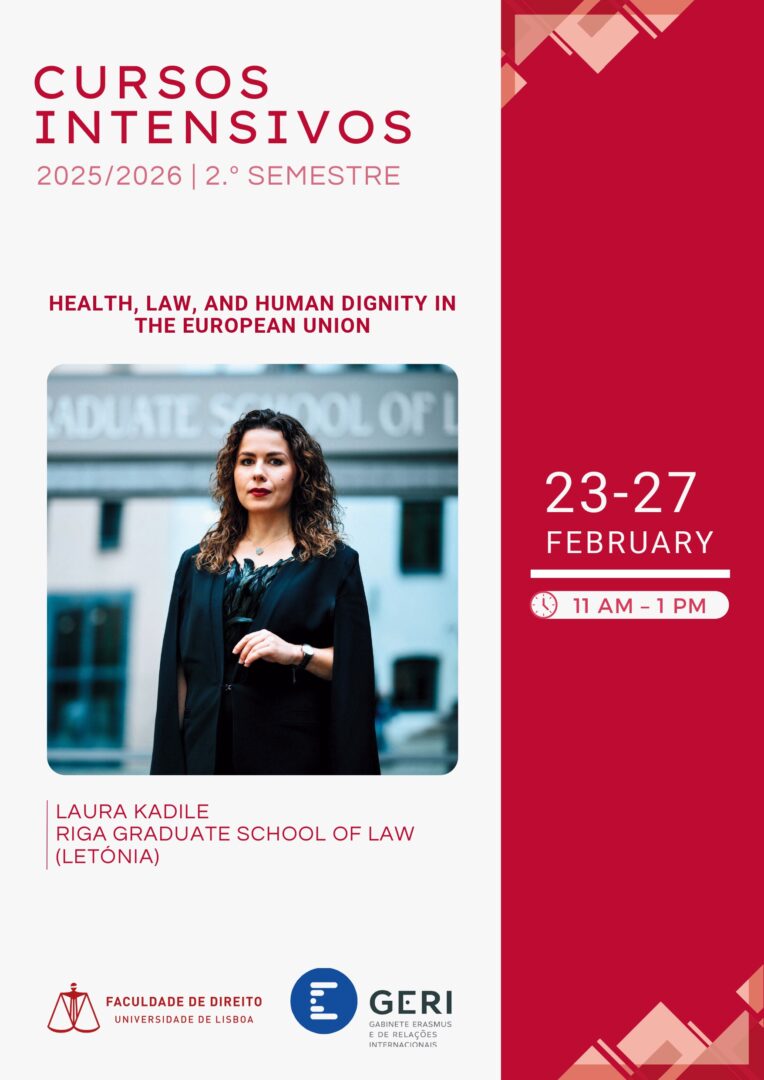 The intensive course “Health, Law, and Human Dignity in the European Union”, taught by Professor Laura Kadile, from the Riga Graduate School of Law, will take place between 23/02/2026 and 27/02/2026, from 11 a.m. to 1 p.m.