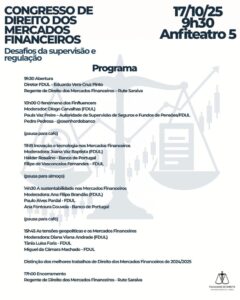 No dia 17 de outubro decorrerá, no Anfiteatro 5 da FDUL, o Congresso de Direito dos Mercados Financeiros – Desafios da supervisão e regulação.