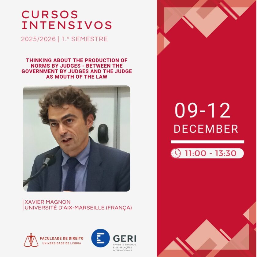 O curso intensivo “Thinking about the Production of Norms by Judges – between the government by judges and the judge as mouth of the law“, lecionado pelo Professor Xavier Magnon, da Aix Marseille Université, realiza-se entre os dias 09/12/2025 e 12/12/2025, das 11h00 às 13h30.