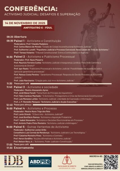 Realizou-se no dia 14 de Novembro de 2025, no Anfiteatro 6, a Conferência Activismo Judicial: Desafios e Superação. O evento foi realizado pelo Instituto de Direito Brasileiro (IDB) em conjunto com a Associação Brasileira de Direito Processual (ABDPro).