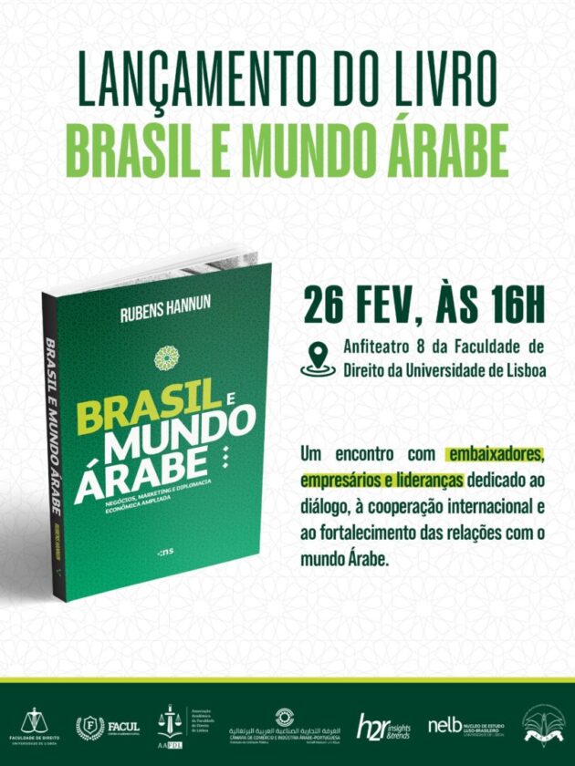 Decorre hoje, 26 de fevereiro, às 16h, no Anfiteatro 8, o lançamento do livro “Brasil e o Mundo Árabe”, sendo um evento dedicado à reflexão sobre a perspetiva comercial entre Portugal, Brasil e o Mundo Árabe.
